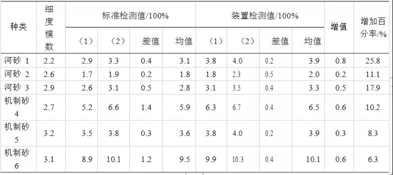 (4)裝置檢測方法具有較好的適用性,機制砂、河砂及其細度模數等因素與含泥量的檢測結果無直接聯系。
