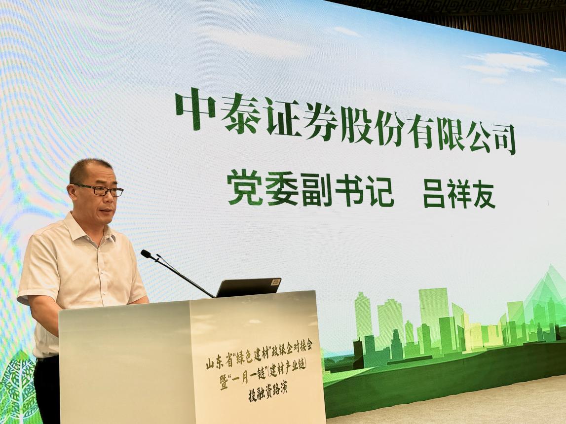 呂祥友表示,中泰證券以建設忠誠、合規、創新、美美與共的一流證券公司為抓手,扛牢服務實體經濟主責主業,致力于為全省經濟社會發展提供高質量金融服務。中泰證券子公司齊魯股權交易中心,認真貫徹落實省委、省政府“高標準建設‘專精特新’專板,打造國內一流區域性股權市場”的工作要求,聚焦“規范培育、助企上市”功能,聚力培育優質中小企業,累計掛牌企業超過6000家,幫助企業實現各類融資1400億元。今年以來,齊魯股交按照省工業和信息化廳部署要求,積極協助舉辦全省“一月一鏈”投融資路演活動,服務企業3200 余家次,達成融資意向超過 190 億元,進一步拓寬了專精特新企業融資渠道。下一步,中泰證券將在省工業和信息化廳、省財政廳、省住房和城鄉建設廳等單位的指導下,牢記服務實體經濟根本宗旨,發揮好齊魯股交 “專精特新”專板的企業培育優勢,持續為建材產業鏈企業提供能感知、有溫度、見效果的綜合金融服務,為我省建材產業綠色低碳高質量發展貢獻中泰力量。
