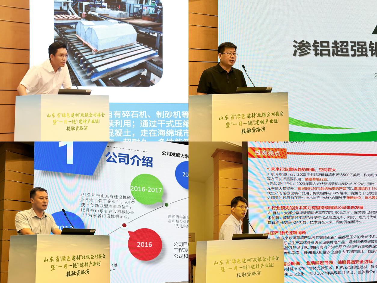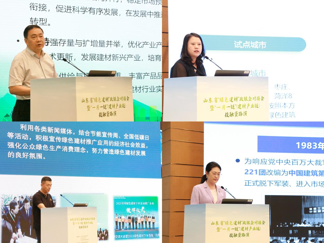 濟寧金虹裝配式建筑科技有限公司、凱盛晶華玻璃有限公司、山東冠縣美安復合材料有限公司、山東泓昊建材科技有限公司、曜靈時代(山東)新能源科技發展有限公司等5家優質“綠色建材”企業進行了現場路演展示。