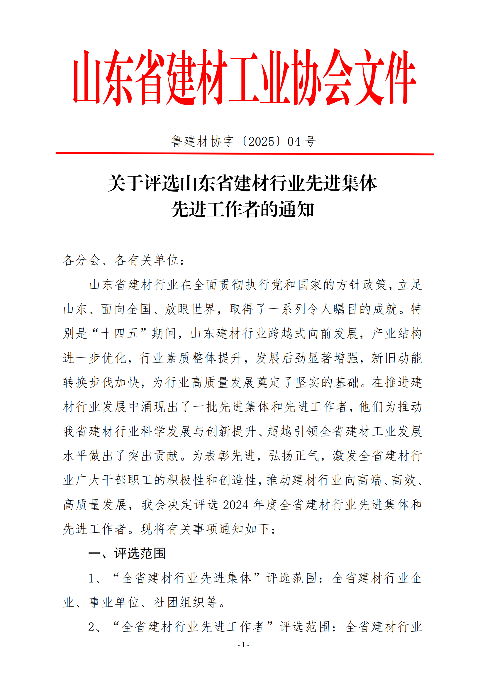 山東省建材工業協會關于評選山東省建材行業先進集體先進工作者的通知