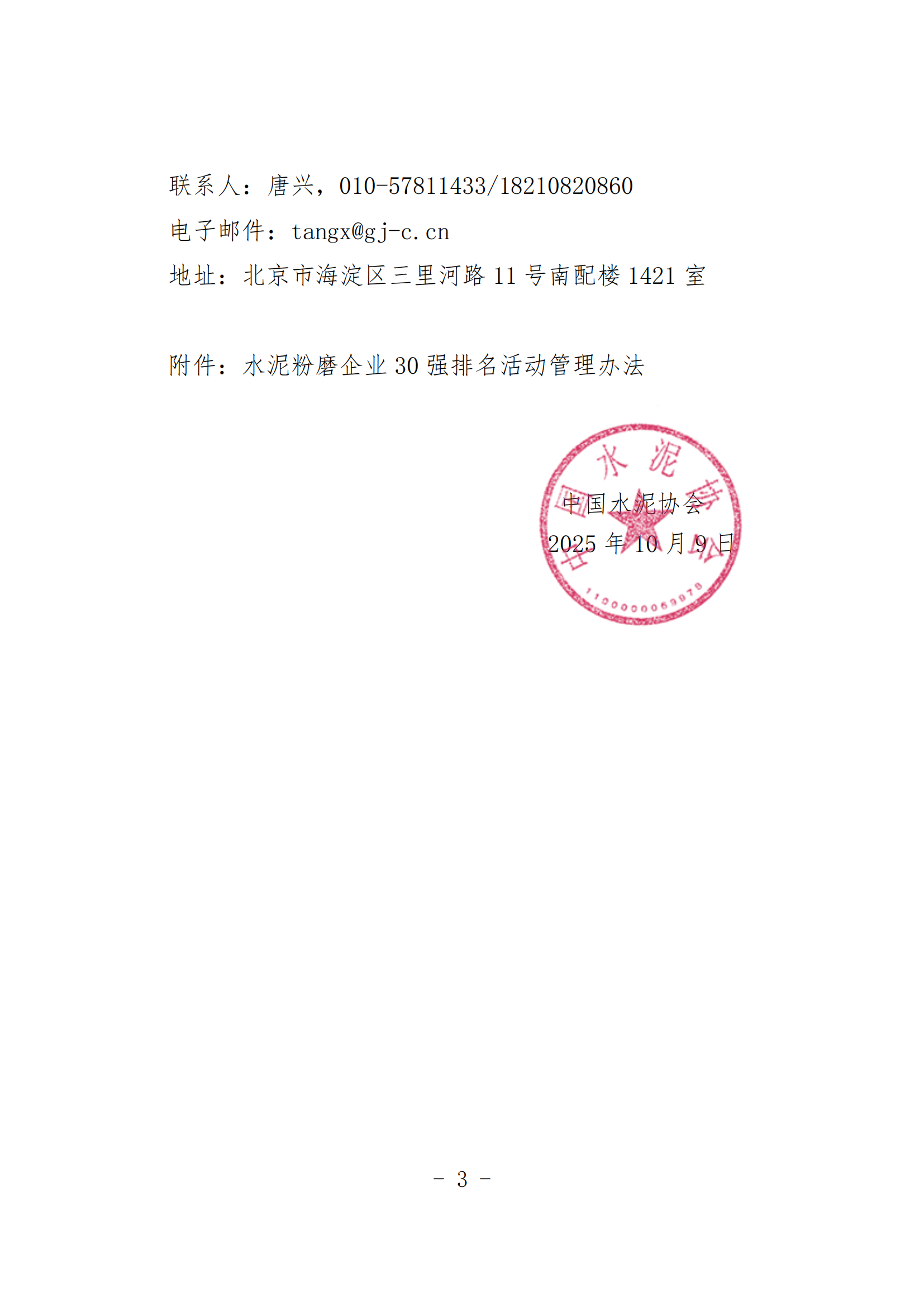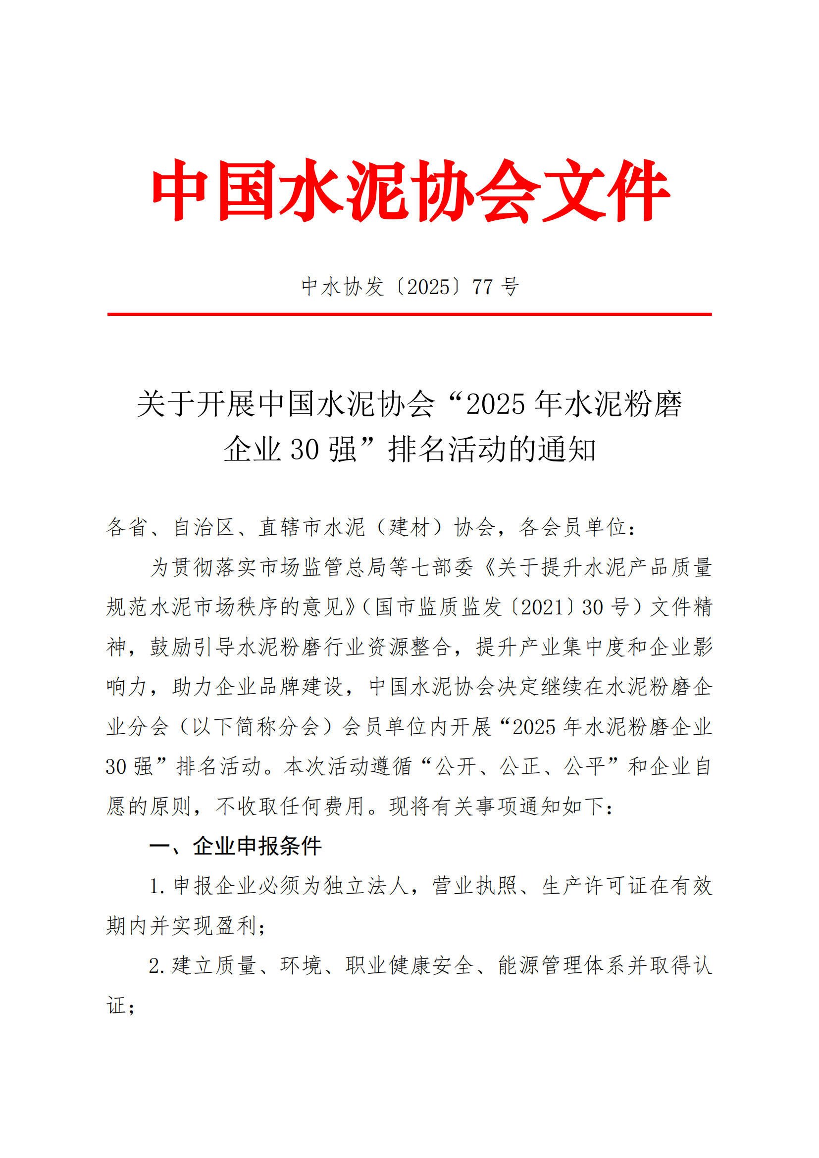 中國水泥協會關于開展中國水泥協會“2025年水泥粉磨企業30強”排名活動的通知
